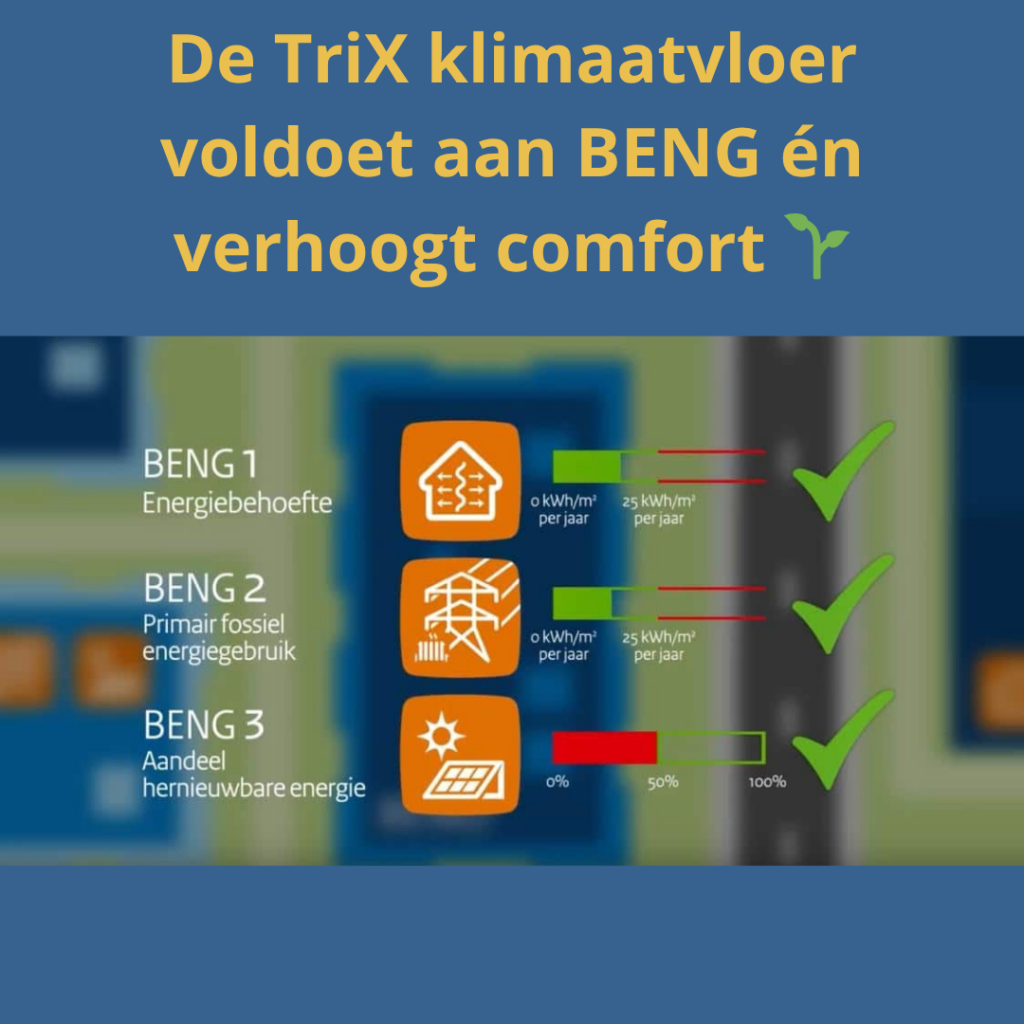 BENG-woningen worden vaak uitgerust met een warmtepomp. TriX Comfort sluit hier naadloos op aan. De warmte of koude uit de vloerverwarming wordt efficiënt benut, waardoor de woning gelijkmatig verwarmd en gekoeld wordt. Dit verhoogt het comfort en verlaagt het energieverbruik.